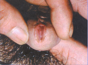 (2)有尿道分泌物及尿道红肿 分泌物常为浆液性或者黏液浓性。尿道口有分泌物,但较淋病的分泌物稀薄,为清稀状或淡黄色,分泌物量也较淋病少。在长时间未排尿或晨起次排尿前溢出少量分泌物,污染内裤,结成黏糊状可封住尿道口(称为糊口)。